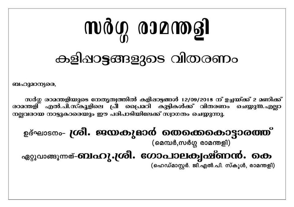 സർഗ്ഗ മെമ്പർ ശ്രീ ജയകുമാർ തെക്കേ കൊട്ടാരത്തിൽ ഉത്ഘാടന കർമം നിർവഹിച്ചു ഹെഡ്മാസ്റ്റർ ശ്രീ ഗോപാലകൃഷ്ണൻ. കെ കളിപ്പാട്ടങ്ങൻ ഏറ്റുവാങ്ങി.
